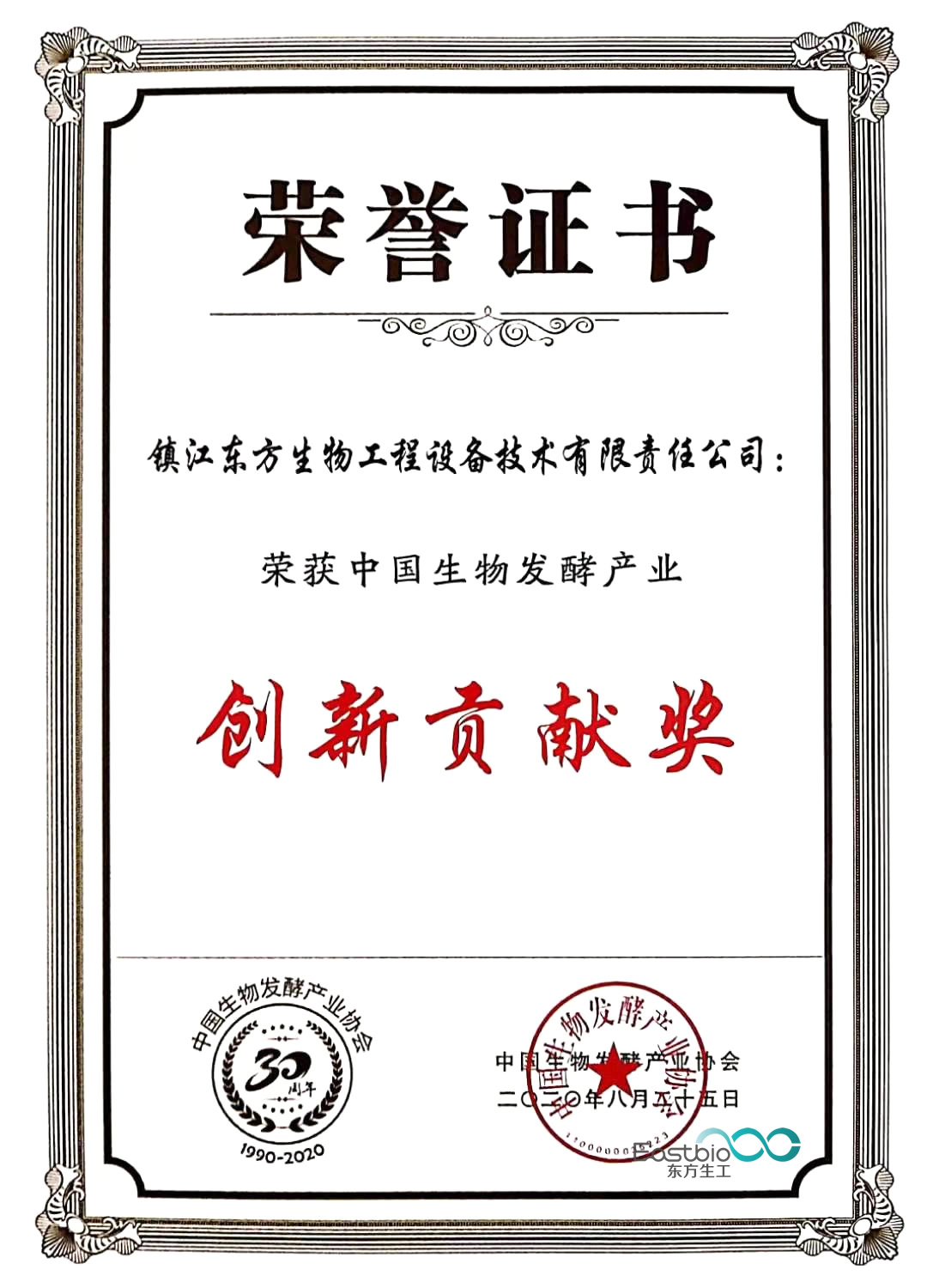 大会对中国生物发酵产业协会成立30年以来对行业发展有重大贡献的单位和个人进行了表彰。镇江东方生物工程设备技术有限责任公司获得了协会颁发的“创新贡献奖”,董事长丁春华荣获“行业精英奖”。同时丁春华董事长经第三次会员代表大会选举当选为中国生物发酵产业协会第三届理事会理事,任期五年。